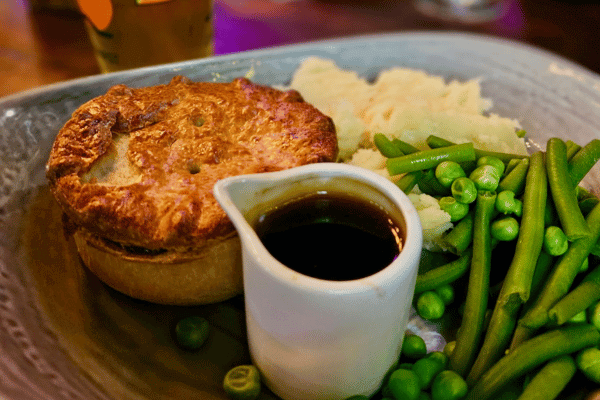 Meat Pie: Since it was lunchtime while touring the Tower Bridge area, we decided to forego the tourist traps that charge too much and offer too little. It was time to seek out a traditional English pub. What we found was not far at all; The Two Bridges Pub on Druid Street. This unassuming local with a glass front has more comfortable seating around the standard bar, think wingback chairs at a table for two. The menu offered upscale “bar” food. Upon lamenting to the charming waitress that I was on a quest for an authentic meat pie, she replied, ‘Of course, we have meat pies.’ They are not on the menu because they are just expected. Two pints later, I was presented with this work of art. The inside was as savory and delicious as it looked in the picture. The moral of this story is: If you don’t ask, you eat tourist food, overpriced and underwhelming.