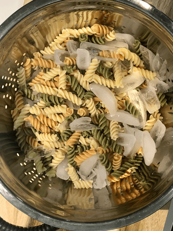 Salt the boiling water and cook your pasta to just shy of al dente. Drain, then quickly add the ice to halt the cooking process and chill the noodles. Once the pasta is cold remove the remaining bits of ice. Drizzle pasta with olive oil just to coat.